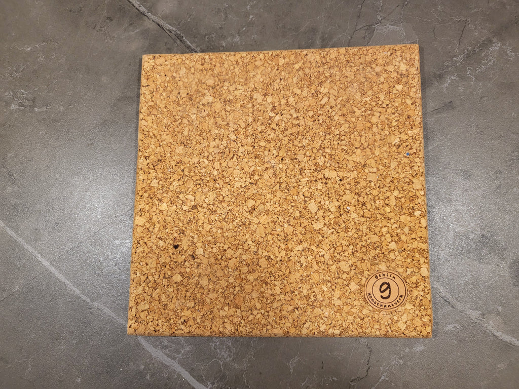 Ett enklare kvadratiskt grytunderlägg av kork, tjockleken är ca 1.5cm, sidorna är 20cm. Mäkret, "Gehlins Konsthantverk" är av läder.