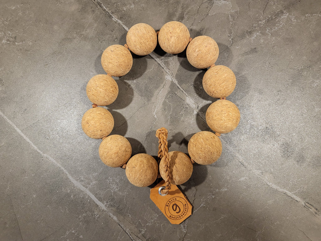 Grytunderlägget tillverkas av 12st korkbollar om 3cm diameter, en ståltråd träs igenom varje korkboll och fäst. Mellan varje korkboll sitter en ring av läder.