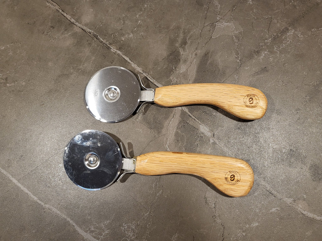 VI tillverkar skaftet på pizzaskäraren, den görs i det vackra materialet Ek och behandlas med hårdvaxolja.