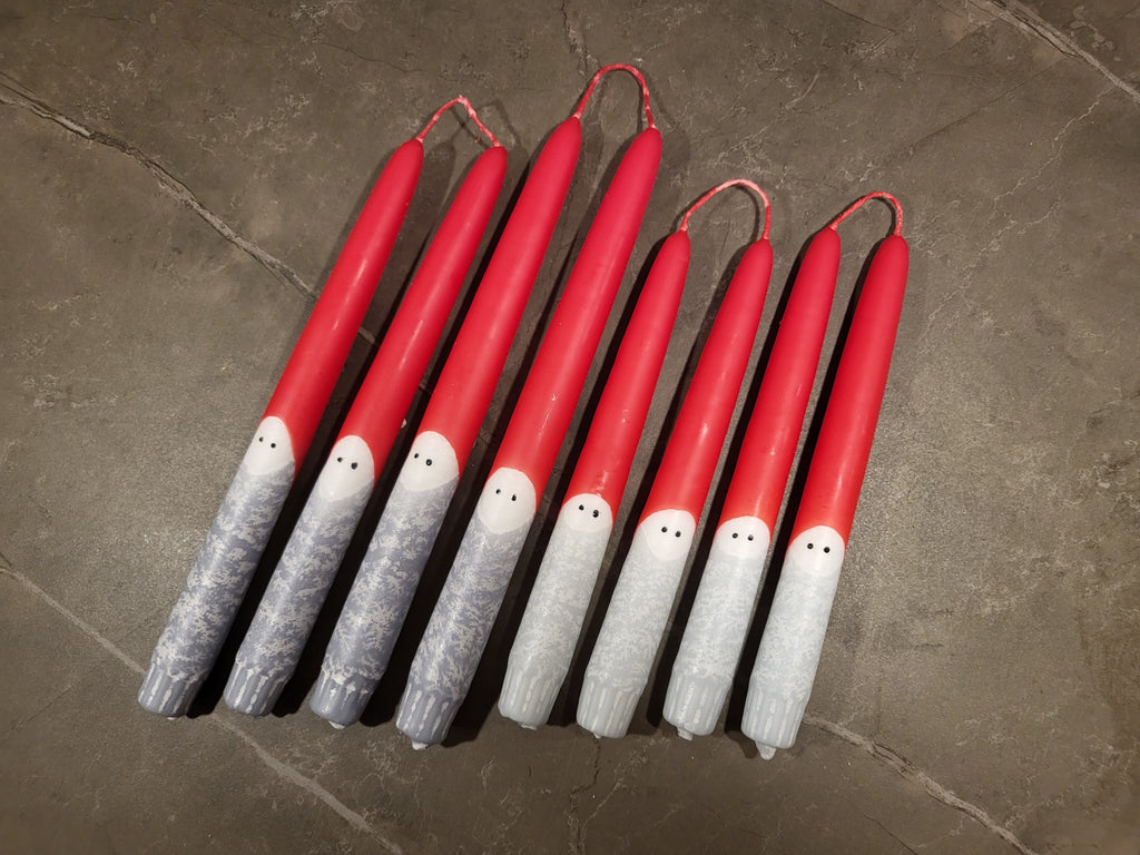 Våra Antiljustomtar handstöper vi i vår egen blandning av stearin och paraffin, därefter doppar vi ljusen i grå samt julröd färg.