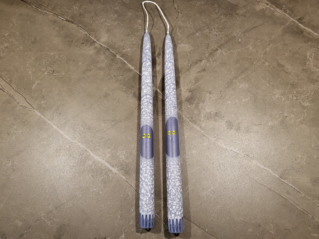 Våra unika Gast- / Poltergeist-ljus handstöpts i askgrå ljusmassa, därefter doppas topp och fot i krackelerings vax som ger den frostade ytan, sist målas ögon dit.